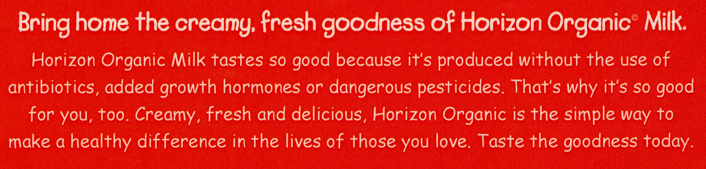 Horizon Organic's first national print campaign made a splash in pubs such as Better Homes and Gardens, People and Martha Stewart Living with a concept that took advantage of Horizon's strongest equities: the color red, the happy cow, and a positive message. This highly successful campaign gave Horizon Organic a ROI of $.40 per dollar spent.